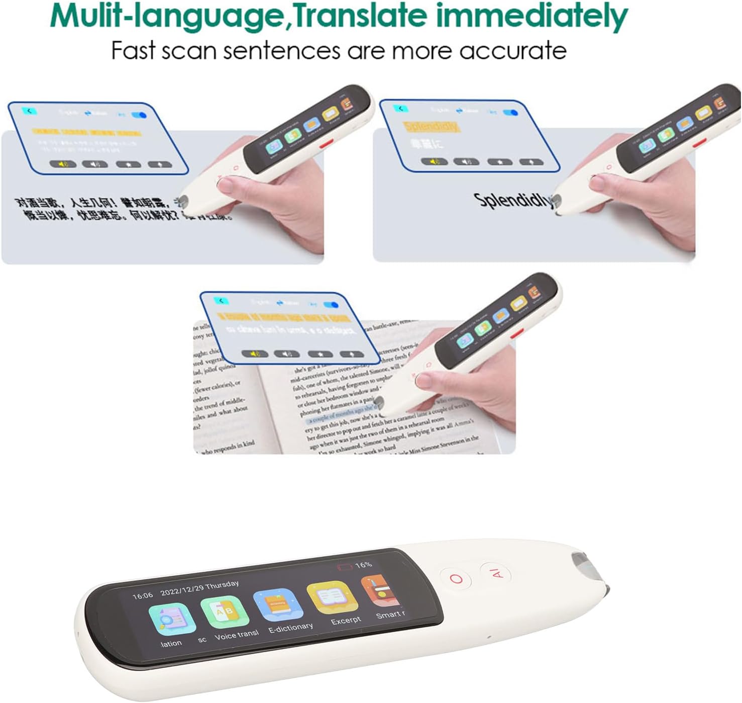 HD Screen, Simple Interface: Translator uses HD high resolution retinal screen, which does not hurt the eyes for a long time. Multi touch visual operation, real time full display, Chinese and English synchronization, no need to turn pages. Simple UI interface design, more user friendly interaction, stronger user experience.