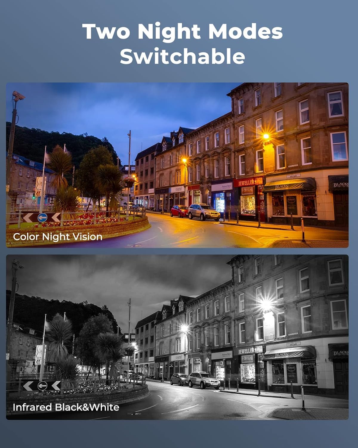 FULL COLOR NIGHT VISION — The Spotlight of the 12MP outdoor surveillance cameras enables a full color night vision. You can schedule it to work at a time period and switch to IR LED mode other time flexibly. The spotlight can also be Motion-activated to deter intruders working with the siren.