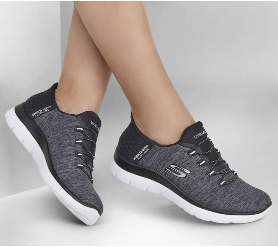 Experience ultimate comfort and convenience with these slip on shoes for women from Skechers. The Summits Dazzling Haze features a soft heathered jersey knit upper with fixed stretch laces and hands-free entry. These womens slip on shoes combine athletic performance with casual style, featuring Air-Cooled Memory Foam insole and a Heel Pillow design that keeps your foot secure. Perfect for active lifestyles, these vegan slip on sneakers for women offer lightweight comfort with a flexible traction outsole.