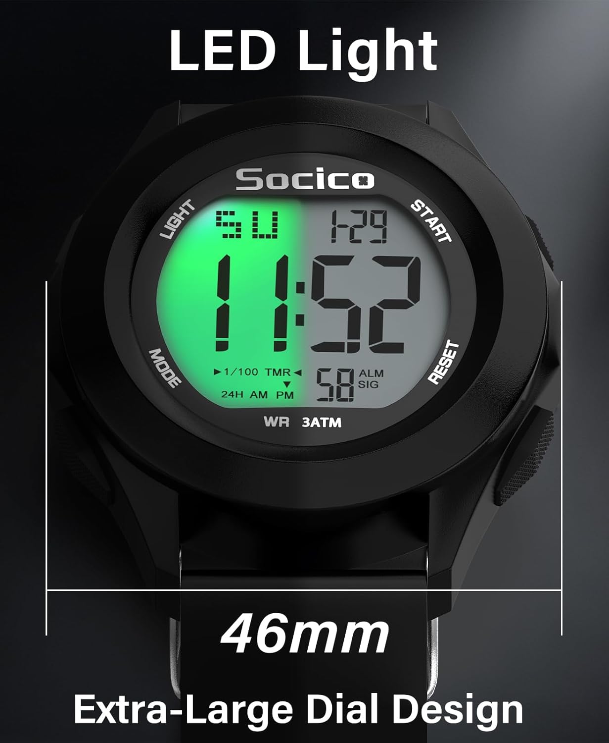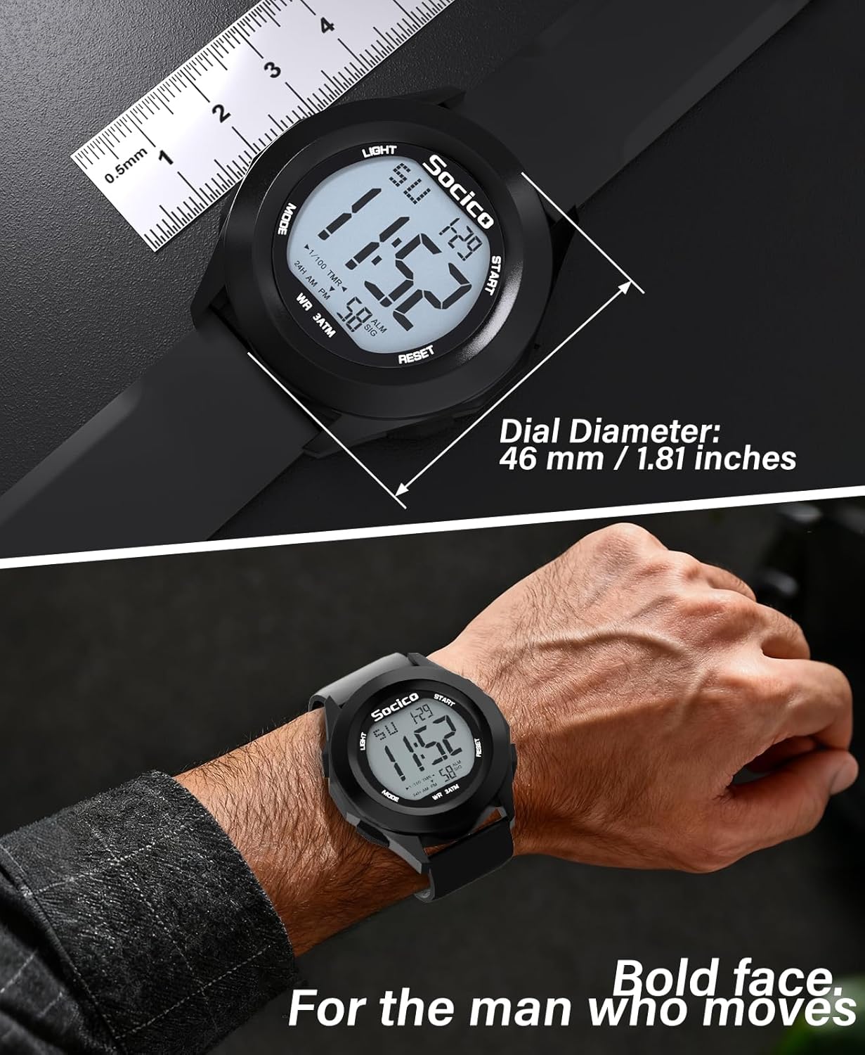 SOCICO Mens Digital Watch Sports Waterproof Outdoor Large Face Military Watches with Stopwatch Back Light Alarm Date Display