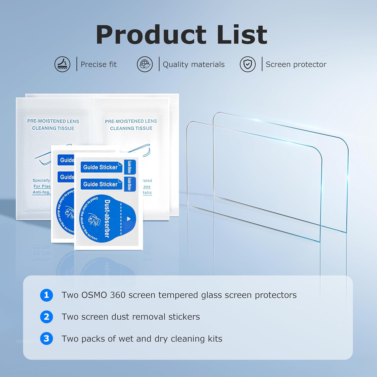 Packing List:Osmo 360 camera screen protector x 2, clean bag x 2,dust removal sticker x 2(Camera Not Included)
