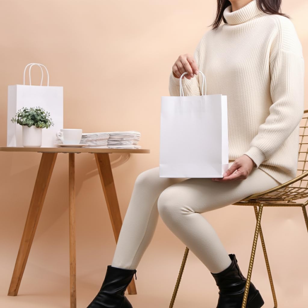SUNCOLOR 25-Pack Medium White Paper Bags with Handles – 8″×4.5″×10″ Shopping Bags – Sturdy Kraft Paper Gift Bags for Retail, Party Favors, Merchandise, Business – Eco-Friendly Packaging