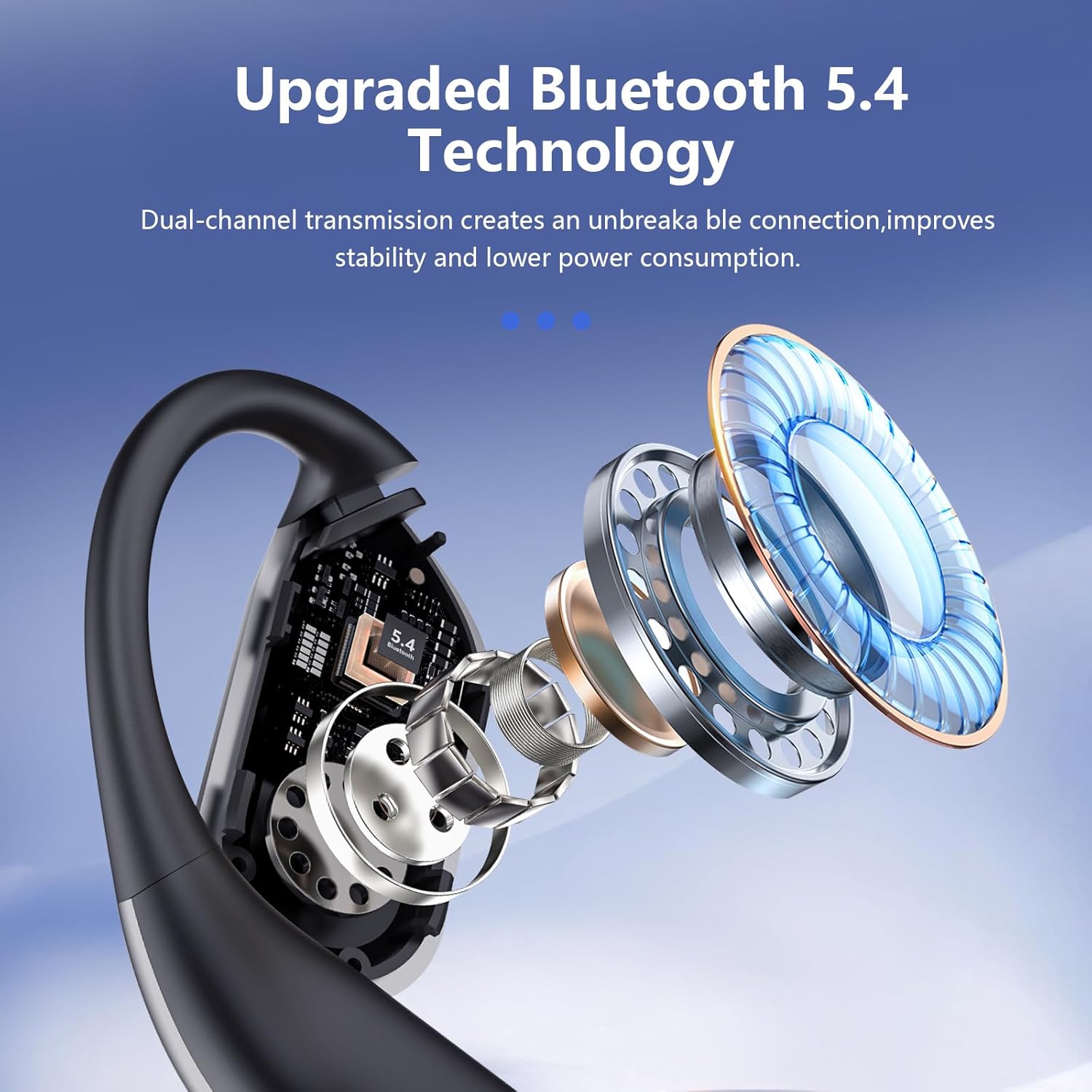 [Cutting-edge Connectivity with Bluetooth 5.4] Propel yourself into the future with these open-ear wireless earbuds flaunting state-of-the-art Bluetooth 5.4 technology. Immerse yourself in lightning-fast data transfer speeds and a rock-solid connection that extends up to 33 feet. Experience seamless, low-latency audio from the moment you liberate them from their case, thanks to the ingenious auto-on and connect feature.