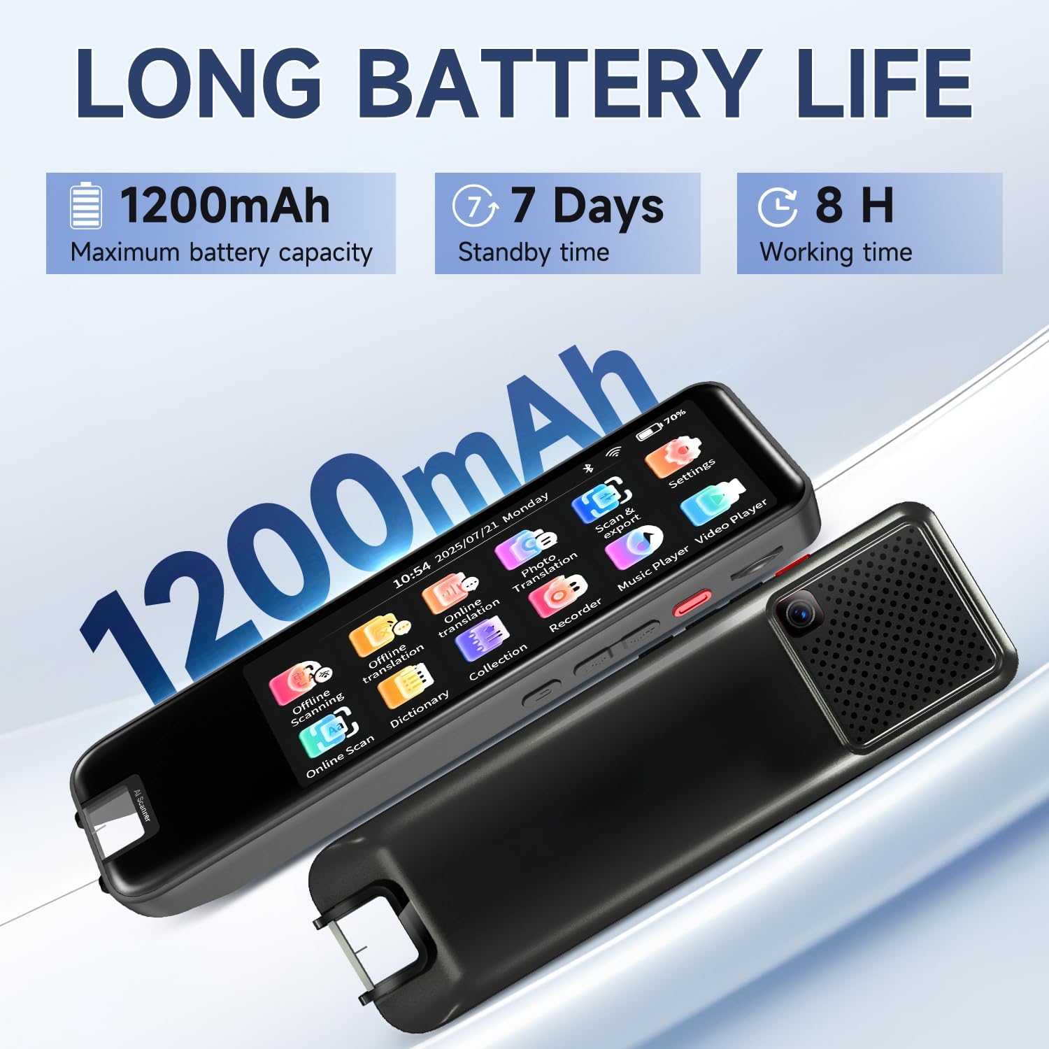 【ALL-IN-ONE READING & TRANSLATION PEN】Our reading pen is lightweight and portable. It is equipped with a 1200mAh battery, which can be used continuously for 4-6 hours, and the standby time is up to one week after 1-2 hours of full charging. This translation device also has a recording function, built-in electronic dictionary and vocabulary lists such as IELTS and TOEFL. Connect Bluetooth headphones to enjoy immersive audio playback. Reading pen for dyslexia, kids and adults. Best gift for taking notes, recording meetings, traveling abroad, studying, and taking exams.