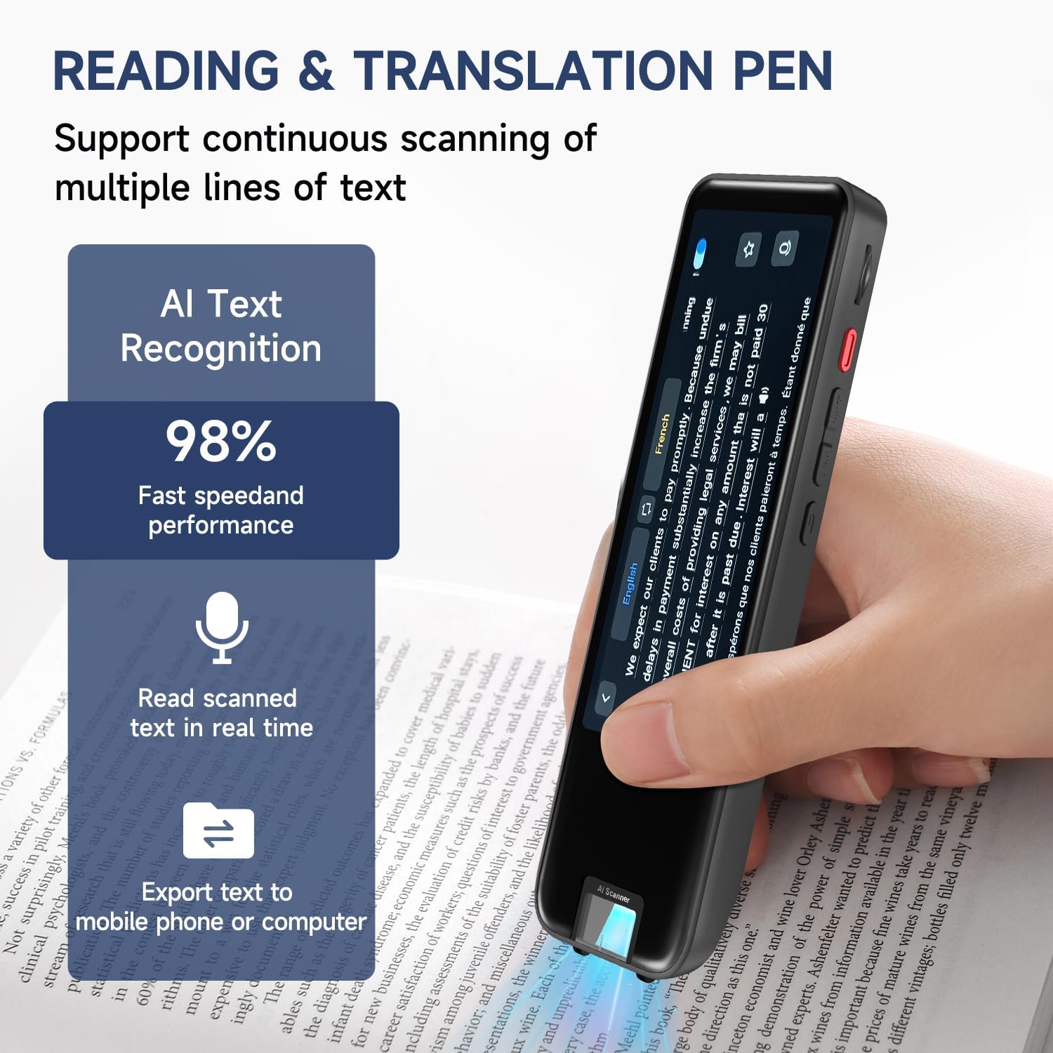【TEXT-TO-SPEECH FUNCTION】The reading pen can scan multiple lines of text and read aloud, and the text and translation will be highlighted on the screen to help users improve their comprehension. Listen to the text live from the pen or use with Bluetooth headphones while scanning.Our translation pen supports online scanning translation in 142 languages, offline scanning translation in 13 languages, with an accuracy rate of up to 98%. This text to speech device can be used as dyslexia reading tools for kids and adults.