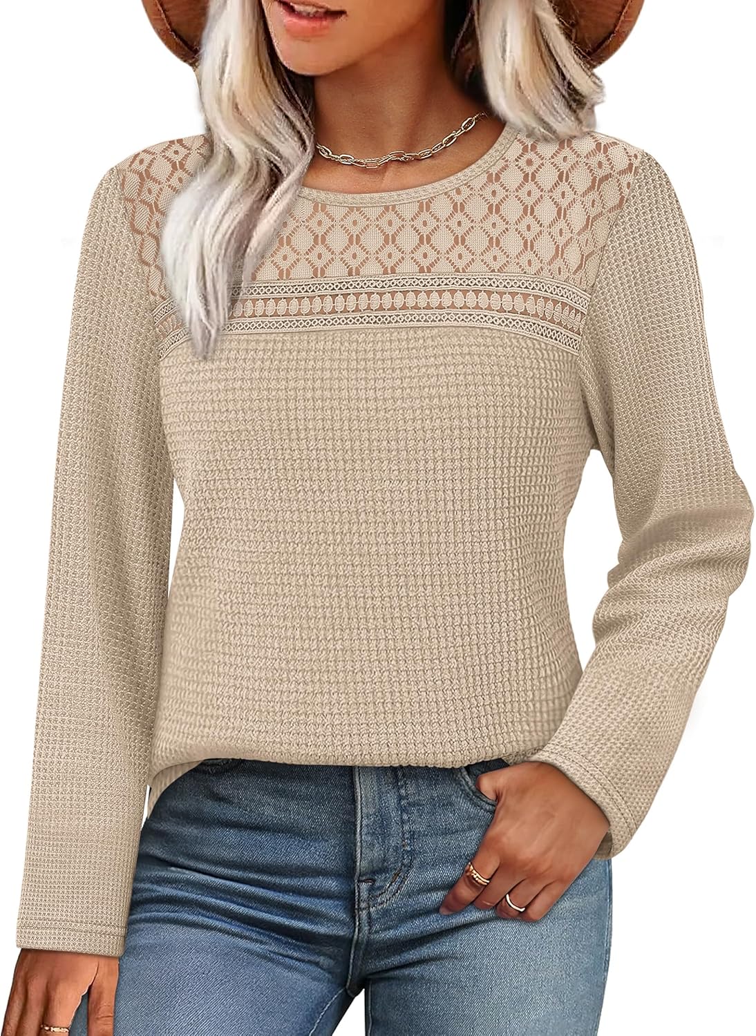 WIHOLL Women Blouses Long Sleeve Shirts Fall Fashion 2025 Lace Waffle Knit Tops