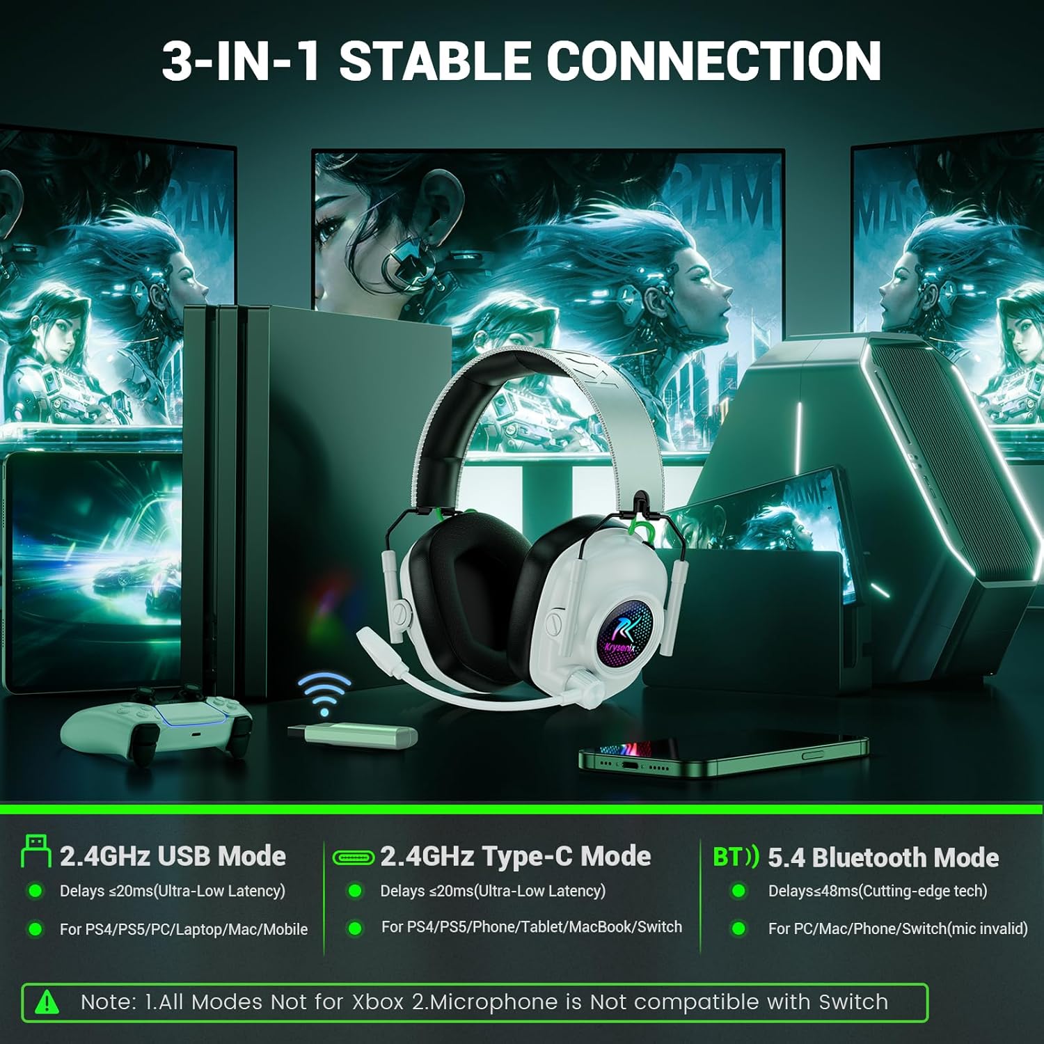 [Versatile Compatibility]Enjoy seamless connectivity with the gaming headset via a 2.4GHz dongle, for PC, PS4, PS5, Mac, Phone, Laptop, Switch and more controllers;Switch to Bluetooth mode for wireless connection to most mobile devices like smartphones, tablets, and Switch, allowing seamless transitions between different devices.Note 1: Combine the 2-in-1 transmitter before connecting to PS5, PS4, PC, or laptop.Note 2:Both modes are not compatible with Xbox. Note 3: The microphone is not available when connected to for Switch. Note 4: Bluetooth modes are incompatible with PS4, PS5.