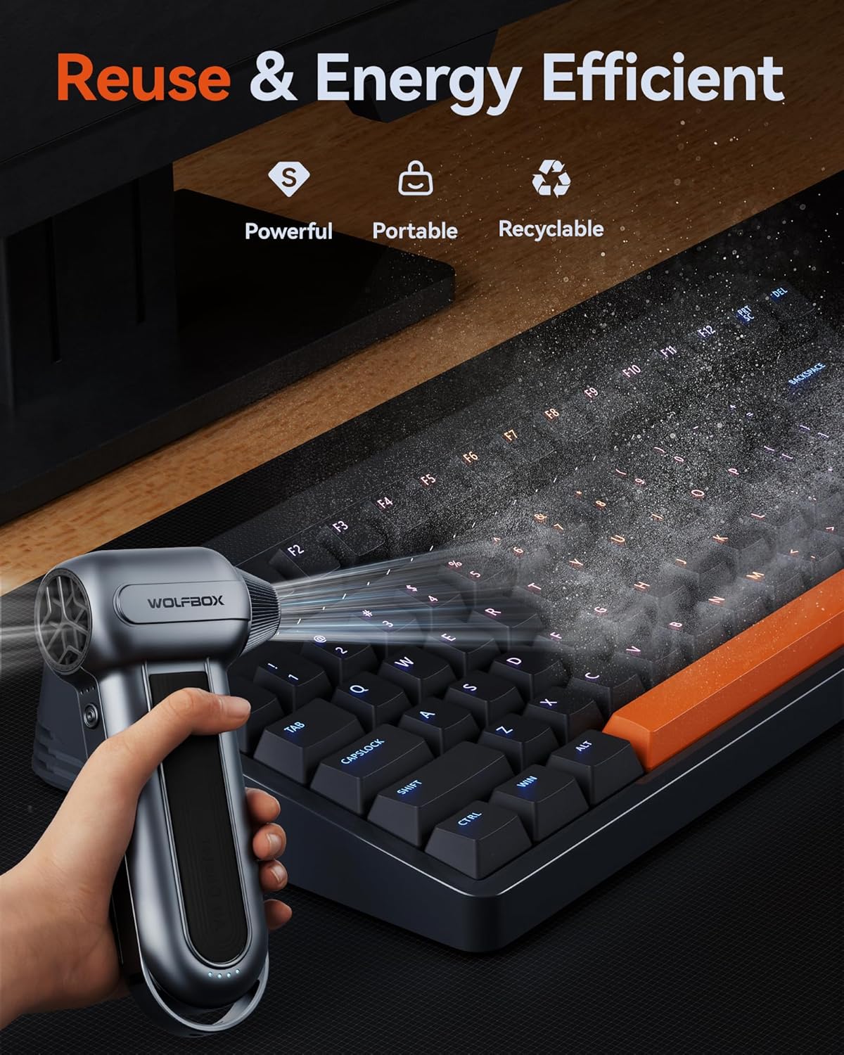 Reuse and Cost-Efficiency: Made from durable materials, the WOLFBOX air duster offers a long battery life and can be reused more than 500 times. It’s a sustainable and economical alternative to single-use compressed air cans, much better choice for your wallet and the planet.
