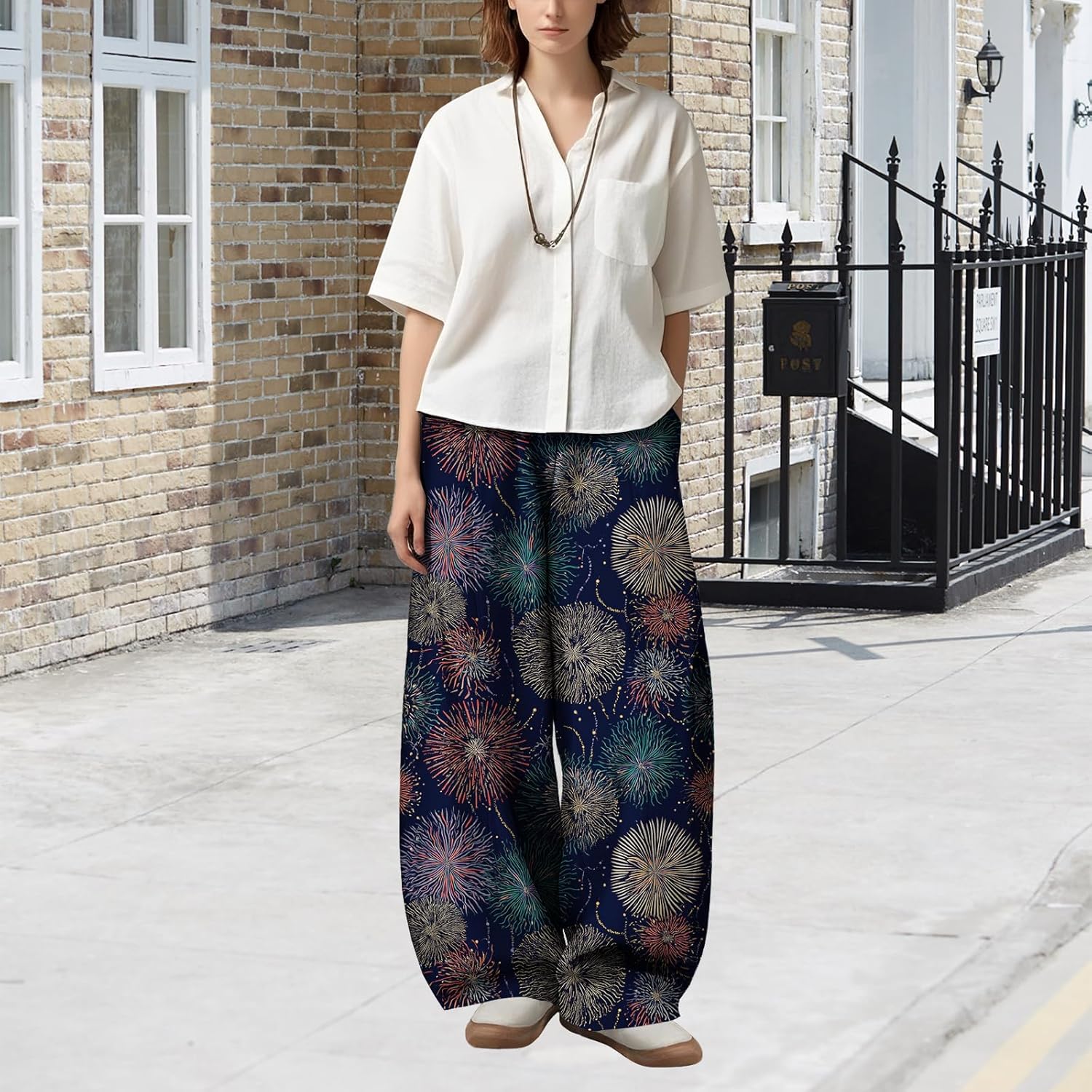 Zaswen Women’s Oversize Loose Fit Breathable Pants Wide Leg Lounge Pants Fashion Casual Fireworks Print Trousers with Pockets